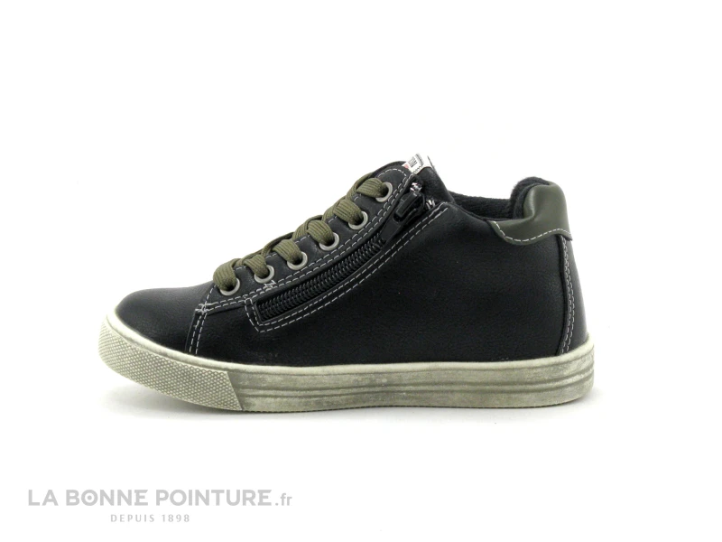 Cette basket montante garçon est en simili cuir noir, avec des bandes bleu jean et rouge sur le côté externe et des étoiles kaki.