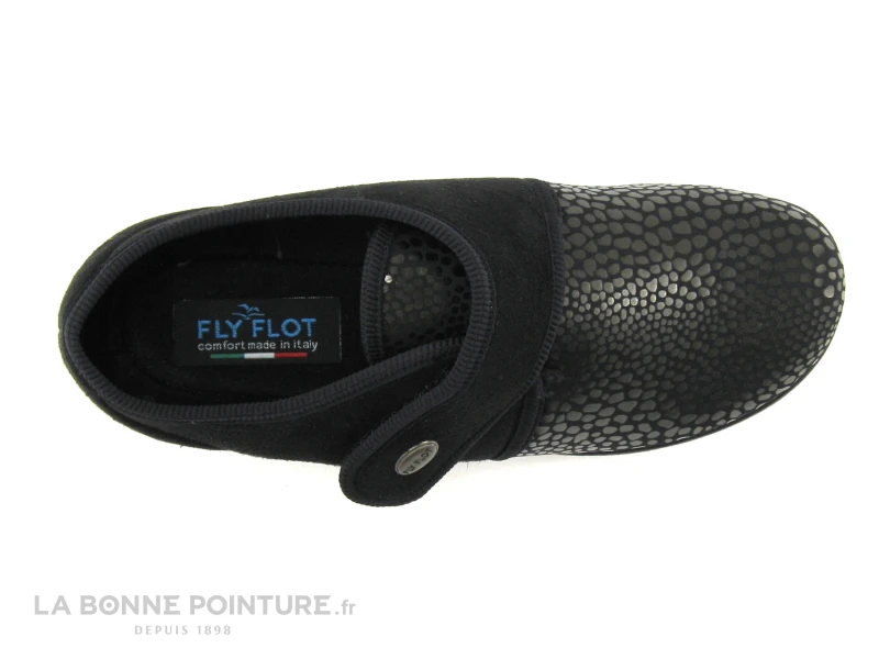 La doublure des chaussures d’intérieur Fly Flot est en velours noir pour un cadre chaud et douillet, et la semelle interne anatomique est en textile.