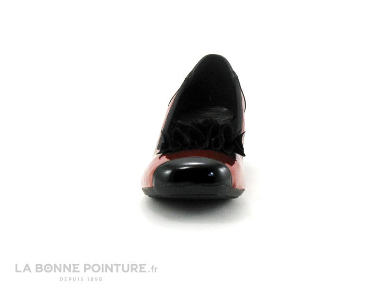 Cette chaussure Femme est noire et rouge verni, avec une bride noir velours en relief sur le dessus.