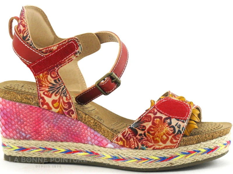 Originales et fabriquées artisanalement, ces superbes sandales rouges à talon compensé Laura Vita Facyo 06 !