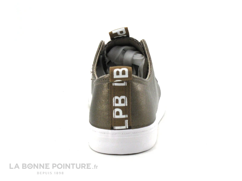 Cette basket basse Femme est en simili cuir marron brillant, ornée d’un ruban sur la languette marqué en blanc LPB.