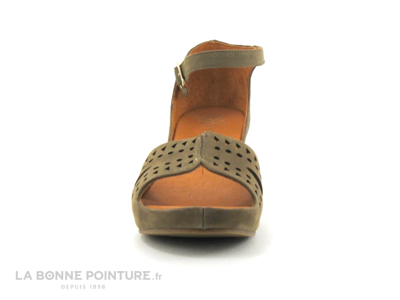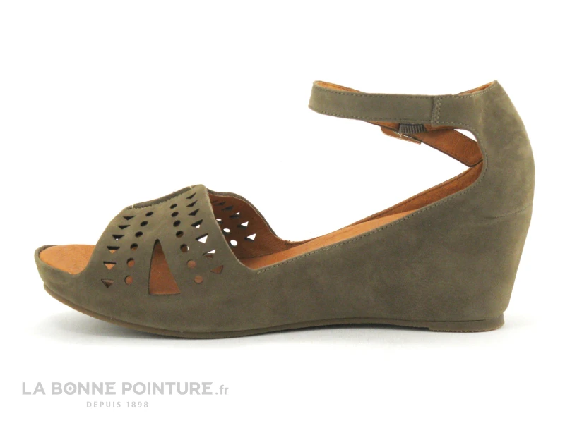Ce nu-pieds Femme à talon compensé est en cuir velouté kaki (buck kaki), avec de petits cercles et triangles perforés sur l’avant.