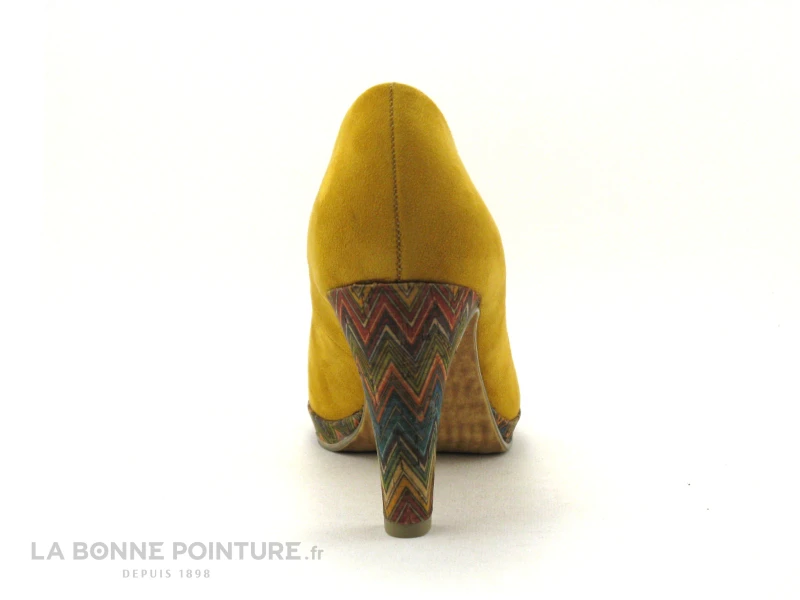 Cette chaussure Femme à petit prix est en textile velouté jaune foncé, avec le talon et le patin avant effet ethnique multicolore.