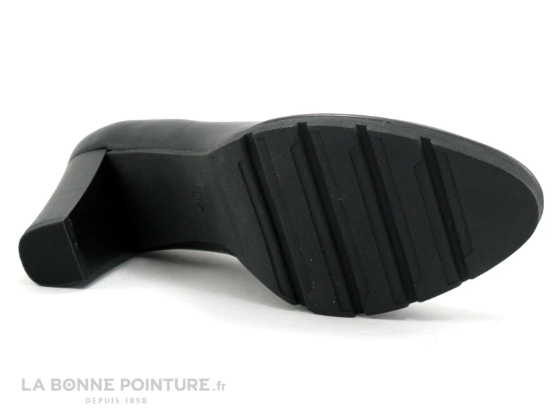Cet escarpin est noir avec une pointe légèrement effilée, et une semelle crantée qui caractérise la chaussure.
