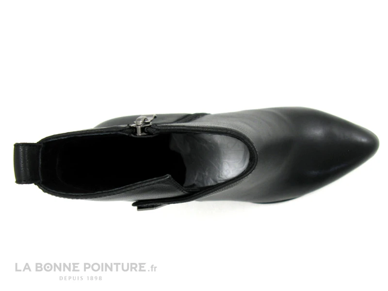 Cette bottine Femme à bout pointu est en cuir lisse noir, avec un côté asymétrique et une petite languette noire à l’arrière.