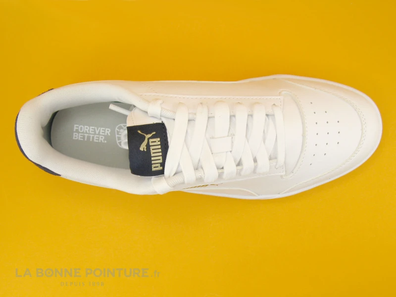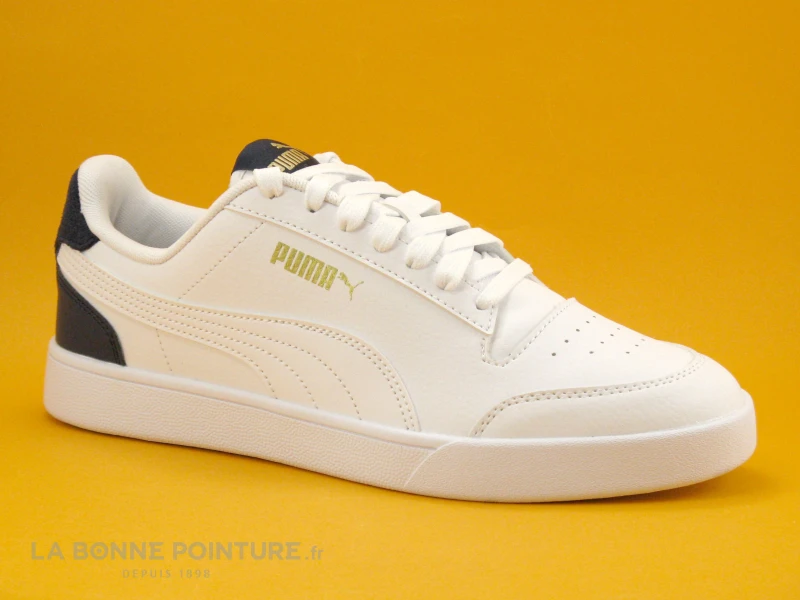 Cette basket Homme Puma Suffle est en simili cuir blanc aspect grainé, avec du bleu foncé à l’arrière ainsi que la marque et le logo Puma en doré sur la chaussure.