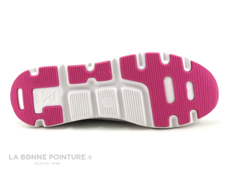 Cette basket slip-on Rieker Revolution est en textile gris clair, avec un peu de rose fuchsia.