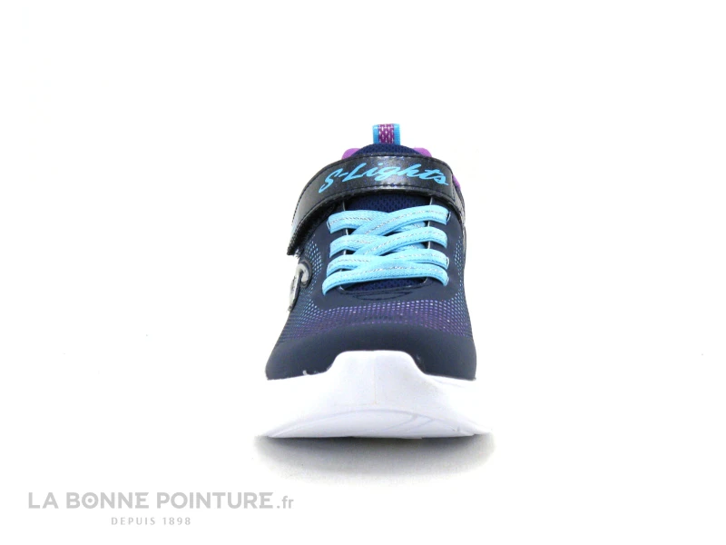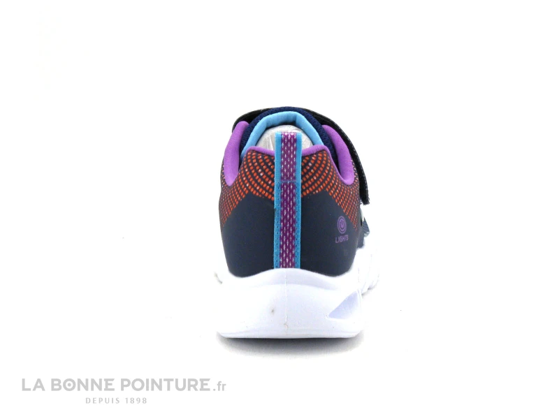 Cette basket à leds fille Skechers Lights® 303700 est bleu marine, avec une partie dégradée aux tons de bleu ciel, d’orange et de violet.
