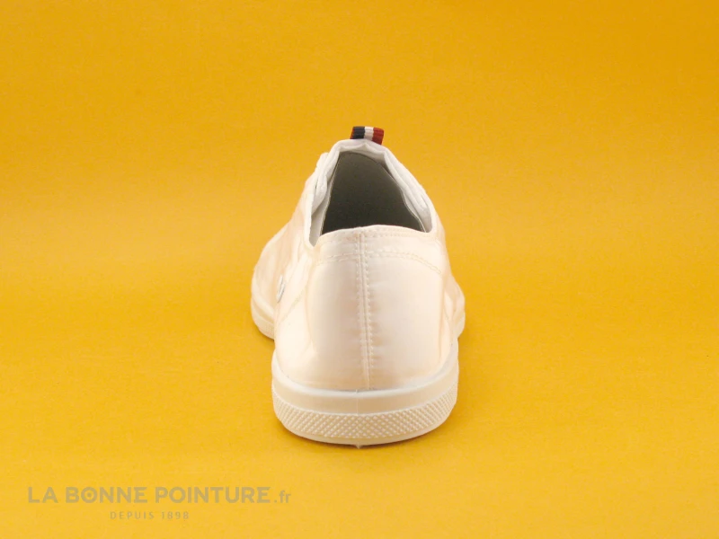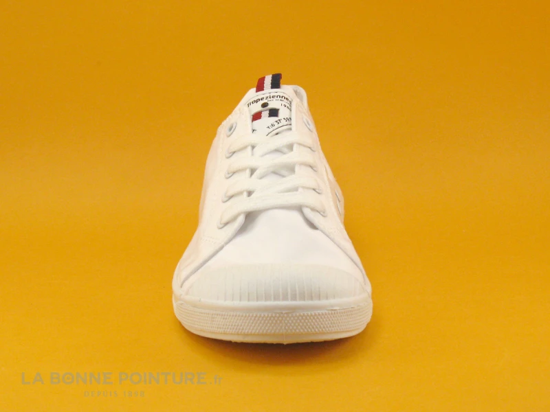 Cette basket Femme Les Tropézienne Chana par M. Belarbi est en nylon blanc satiné, avec un ruban bleu blanc rouge sur la languette associé à un écusson marqué Les Tropéziennes.